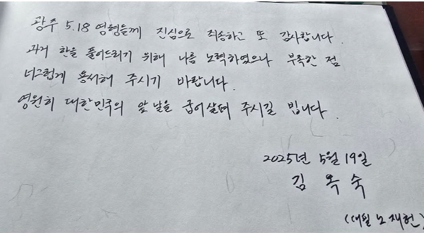김옥숙 여사는 방명록 대신 미리 준비해 온 글을 낭독하며 5월 영령에게 사죄와 감사의 뜻을 전했다. 글에는 "광주 5·18의 영령들께 진심으로 죄송하고 또 감사합니다. 과거 한을 풀어드리기 위해 나름 노력하였으나 부족한 점 너그럽게 용서해 주시기 바랍니다. 영원히 대한민국의 앞날을 굽어살펴 주시기 바랍니다"라는 내용이 담겼다.