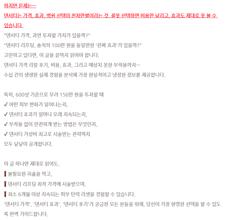 TIP: - 덴서티 이벤트나 패키지 할인 활용 필수 - 2~3회 패키지 구매 시 15~30% 절약 가능
