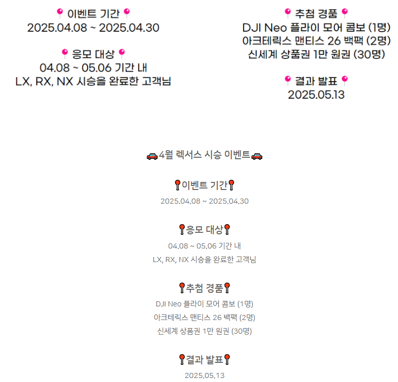 - 대상 차종: LX, RX, NX 시승 완료 고객