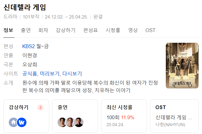 1. 신데렐라 게임 4월 25일 종영! 드라마 개요