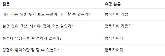 이러한 지식은 경험과 관찰을 통한 체화를 통해 습득되며, 단기간 교육으로는 전달이 어렵습니다.