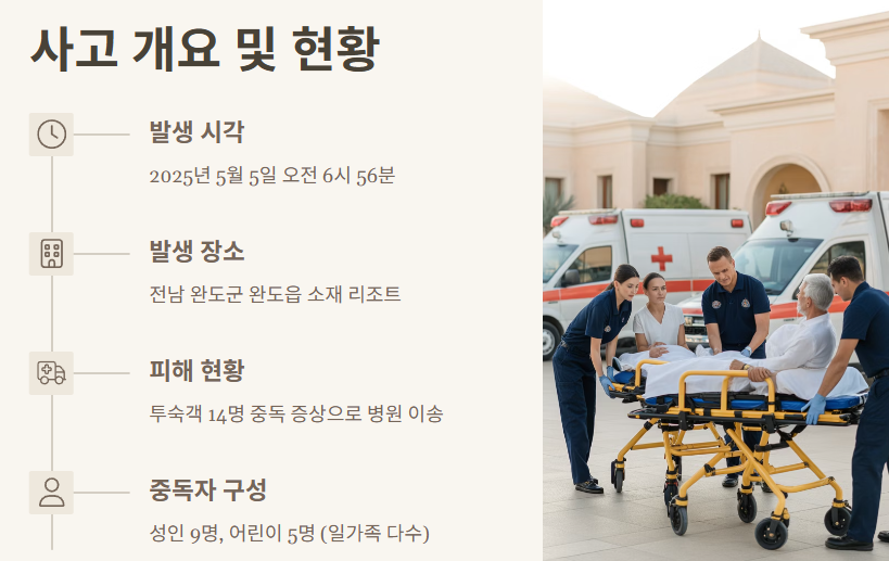2025년 5월 5일 오전 6시 56분, 전남 완도군 완도읍에 위치한 한 리조트에서 일산화탄소(CO) 누출로 인한 가스 중독 사고가 발생했습니다. 이 사고로 14명의 투숙객이 두통과 어지럼증 등 중독 증상을 호소하며 병원으로 긴급 이송됐습니다. 특히 어린이 환자 5명이 포함되어 있어 사회적 충격이 컸으며, 다행히 모두 경상으로 생명에는 지장이 없는 것으로 알려졌습니다.
