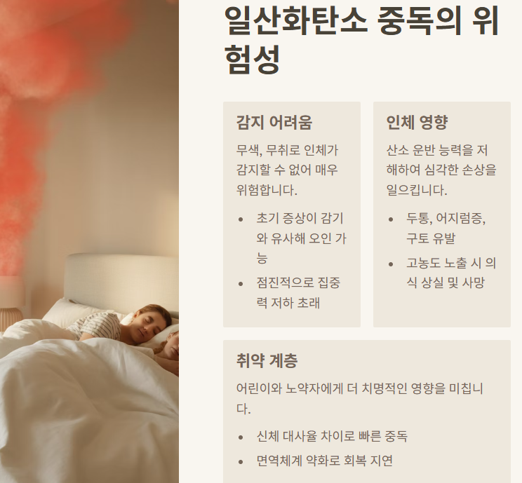 일산화탄소는 무색무취의 유독가스로, 공기보다 가볍고 조용히 스며듭니다. 혈액 내 산소 운반을 방해하여 두통, 구토, 혼란, 심한 경우 호흡 정지에 이르게 할 수 있습니다. 중독이 의심될 경우 즉시 환기를 시도하고, 119에 신고 후 병원으로 이동해야 합니다.