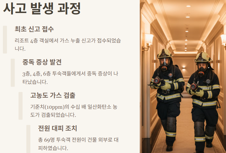 당시 리조트에는 총 69명의 투숙객이 21개 객실에 분산되어 있었습니다. 이 중 특히 3층, 4층, 6층 투숙객들이 일산화탄소에 노출된 것으로 파악됐습니다. 피해 투숙객들은 건물 밖으로 대피했으며, 현장에서 측정된 CO 농도는 기준치의 수십 배를 초과해 매우 위험한 상태였습니다.