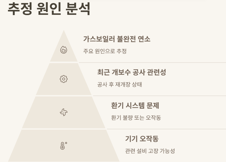 사고 원인은 현재까지 4층 보일러실에서 누출된 일산화탄소가 건물 복도와 객실로 스며들며 확산된 것으로 추정됩니다. 보일러의 배기 시스템 이상, 즉 외부로 정상 배출되어야 할 가스가 내부로 역류하면서 사고가 발생한 것으로 보이며, 보일러실의 점검 소홀 및 경보기 작동 여부 또한 중점 조사 대상입니다.