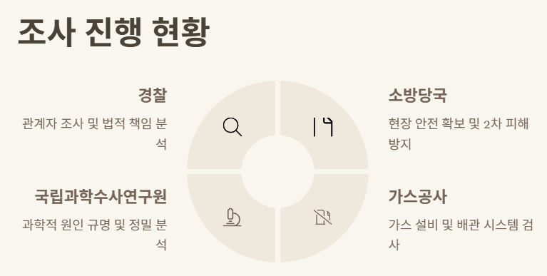 현재 리조트 건물 전체는 출입 통제 중이며, 경찰, 소방당국, 한국가스안전공사가 공동으로 사고 원인을 정밀 조사하고 있습니다. 한국가스안전공사는 특히 보일러실 배기관 연결 상태, 경보기 작동 상태, 정기 점검 기록 등을 집중적으로 조사 중입니다.