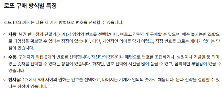 - 수동: 번호를 직접 선택해 데이터 기반 전략 적용 가능