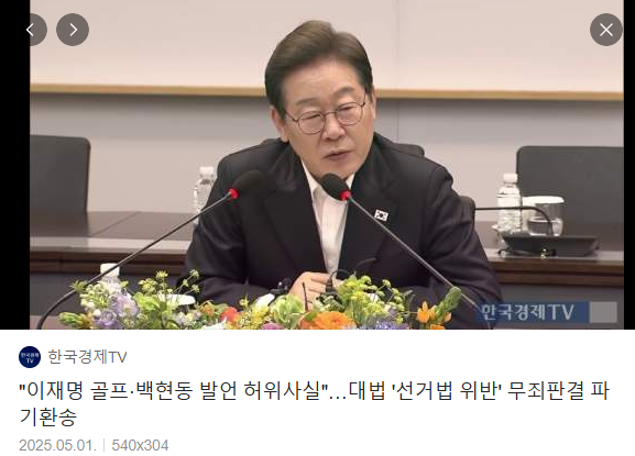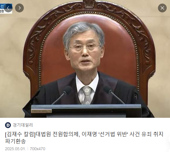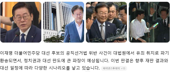 2025년 5월 1일, 이재명 더불어민주당 대선 후보의 공직선거법 위반 혐의에 대한 대법원 전원합의체 판결에서 원심(2심)의 무죄 판결이 파기환송되었다. 이에 따라 향후 정치권에 미칠 영향에 대한 다양한 전망이 나오고 있다.