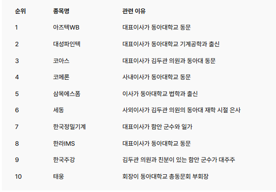 김두관 관련주는 다음과 같은 기준으로 선정되었다: