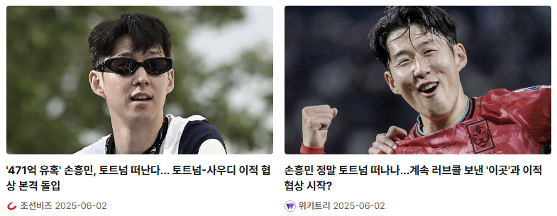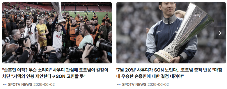 영국 일간지 더선은 "사우디 클럽들이 손흥민을 호날두의 대체자로 주목하고 있다"며, 올여름 거액의 제안이 오면 토트넘이 그의 이적을 고려할 수 있다고 보도했습니다. 손흥민의 사우디행 가능성이 재점화된 셈입니다.