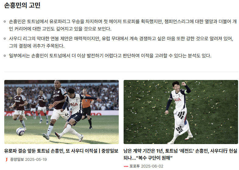 손흥민의 사우디 이적설은 단순한 루머가 아니라, 토트넘의 재정적 고민과 손흥민의 커리어 고민을 동시에 드러냅니다. 향후 그의 선택이 어떻게 될지, 그리고 토트넘의 향방이 어떻게 달라질지 지켜봐야겠습니다.