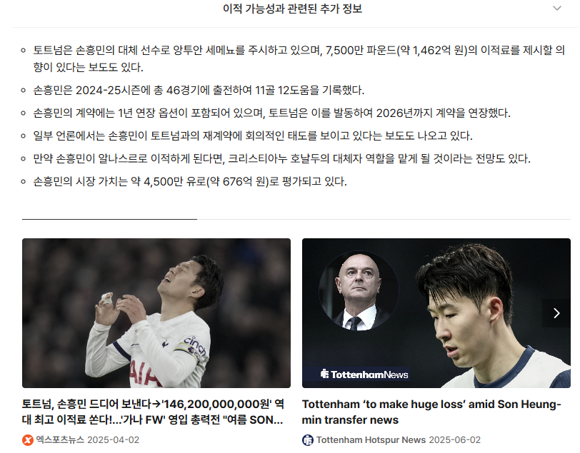 2025년 1월, 토트넘은 손흥민과의 계약에 포함된 1년 연장 옵션을 발동하며 2026년까지의 계약을 확정했습니다. 이는 손흥민의 상징성과 리더십을 높이 평가한 결정으로, 팬들은 "손흥민의 잔류"에 안도했습니다. 그러나 불과 몇 달 만에 다시금 이적설이 불거졌습니다.