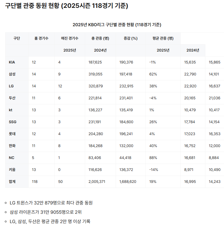 - LG 트윈스: 32만 879명으로 전체 최다 관중 기록, 홈 14경기 중 12경기 매진