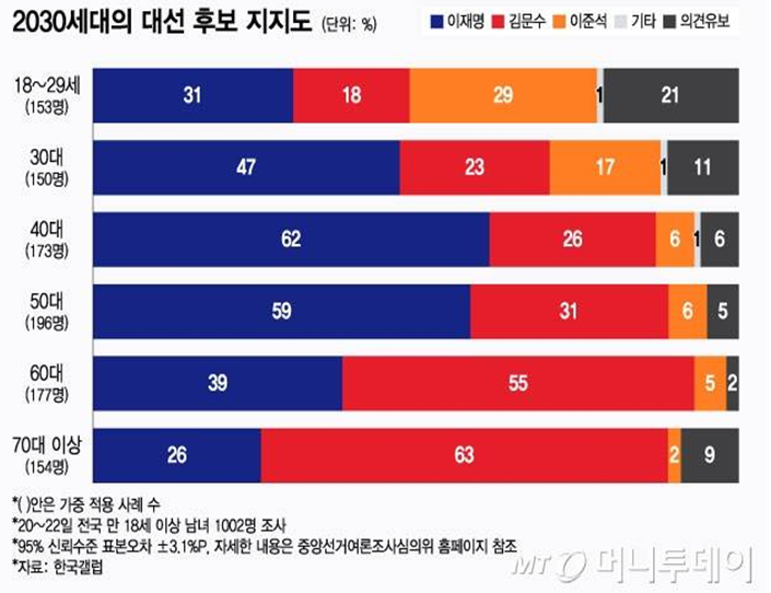전문가들은 “2030세대는 기성세대의 정치 논리보다 ‘나의 삶에 도움이 되느냐’를 기준으로 후보를 선택한다”고 말합니다. 장안대 박창환 교수는 “이들의 관심을 얻으려면 낡은 프레임을 벗고, 2030세대가 원하는 비전과 공감을 보여줘야 한다”고 강조했습니다. 실제로 한국갤럽 조사 결과, 20대에서는 이재명 후보(31%)와 이준석 후보(29%)의 지지율이 오차범위 내에서 엇갈렸고, 30대에서는 이재명 후보(47%)가 우위를 보였습니다.