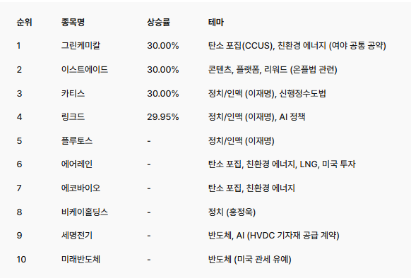 - 탄소 포집 및 친환경 에너지: 탄소 포집 기술이 여야 공통 공약으로 부상하면서 그린케미칼, 에코바이오, 에어레인 등이 강세를 나타냈습니다.