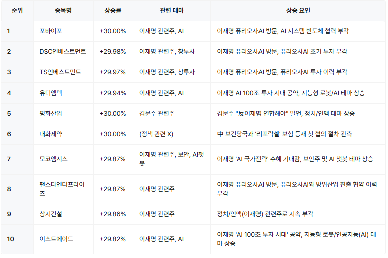 - 이재명 관련주 강세: 이재명 전 대표가 퓨리오사AI를 방문한 후, 관련 투자 기업 및 AI 관련주들이 전반적으로 강세를 보였다.
