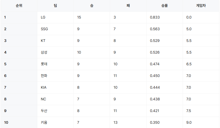 4월 15일 경기 종합 순위