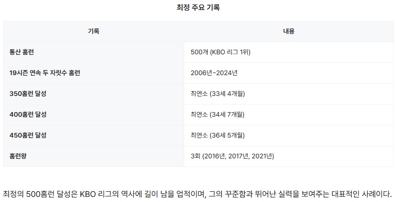 이 대기록은 단순한 숫자 이상의 의미를 지닙니다. 꾸준함과 자기 관리, 그리고 기술적 완성도가 어우러진 결과로, 최정은 단일 시즌이 아닌, 20년 넘게 정상을 지킨 상징적 존재입니다.