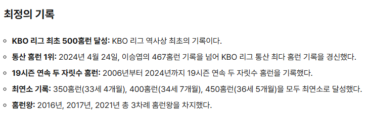 - 2024년: 이승엽의 467홈런 기록 돌파 → 통산 홈런 1위