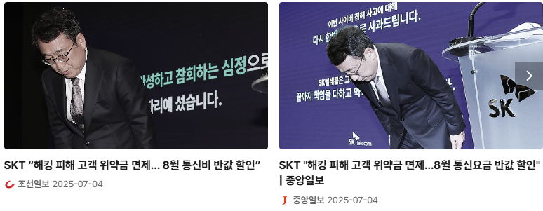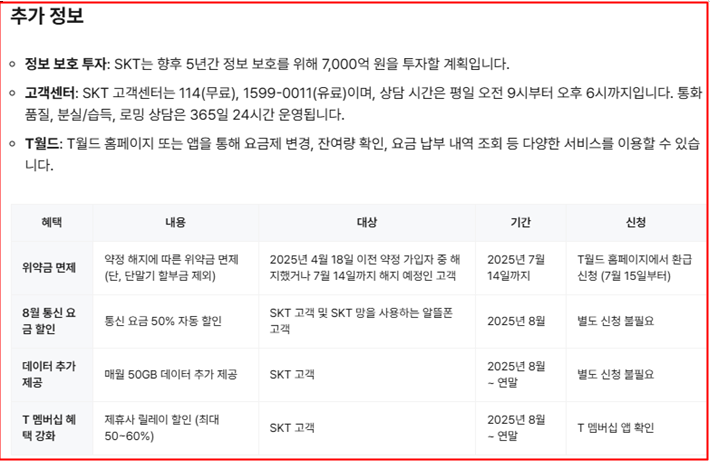 SK텔레콤 고객 여러분께 이번 사고로 큰 불편을 끼쳐드린 점, 다시 한 번 사과의 말씀을 드립니다. 모든 고객분들께 실질적인 보상이 이루어질 수 있도록 노력하고 있으며, 위약금 면제 신청 기한(7월 15일 시작)을 절대 놓치지 마시길 바랍니다.